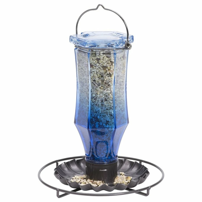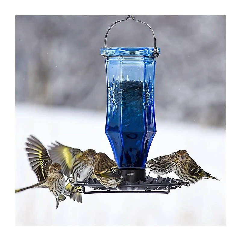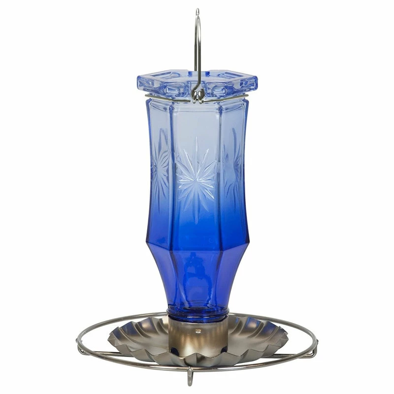 Attract wild birds to your yard while adding a touch of vintage glam with the Perky-Pet Sapphire Starburst Vintage Glass Wild Bird Feeder. Embossed starburst accents adorn the sapphire blue antique style glass bottle. An all-metal base with a brushed nickel finish complete the elegant look of this stylish bird feeder. Seed stays fresh and dry with the addition of drain holes on the seed tray. Cleaning and filling has never been easier than with this bird feeder.